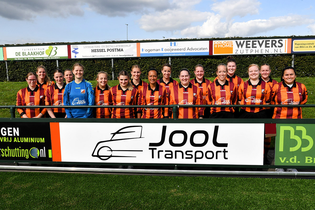 Afgelopen zaterdag heeft fotograaf Hans ten Brinke de dames op de foto gezet bij reclamebord van Jool Transport. Omdat eigenaar Jeffrey Jonker niet aanwezig kon zijn, overhandigde Henk Wevers namens de sponsorcommissie een mooie bos bloemen aan Ariska, de vrouw van Jeffrey. Ariska voetbalt zelf ook voor FC Zutphen Vrouwen 2.