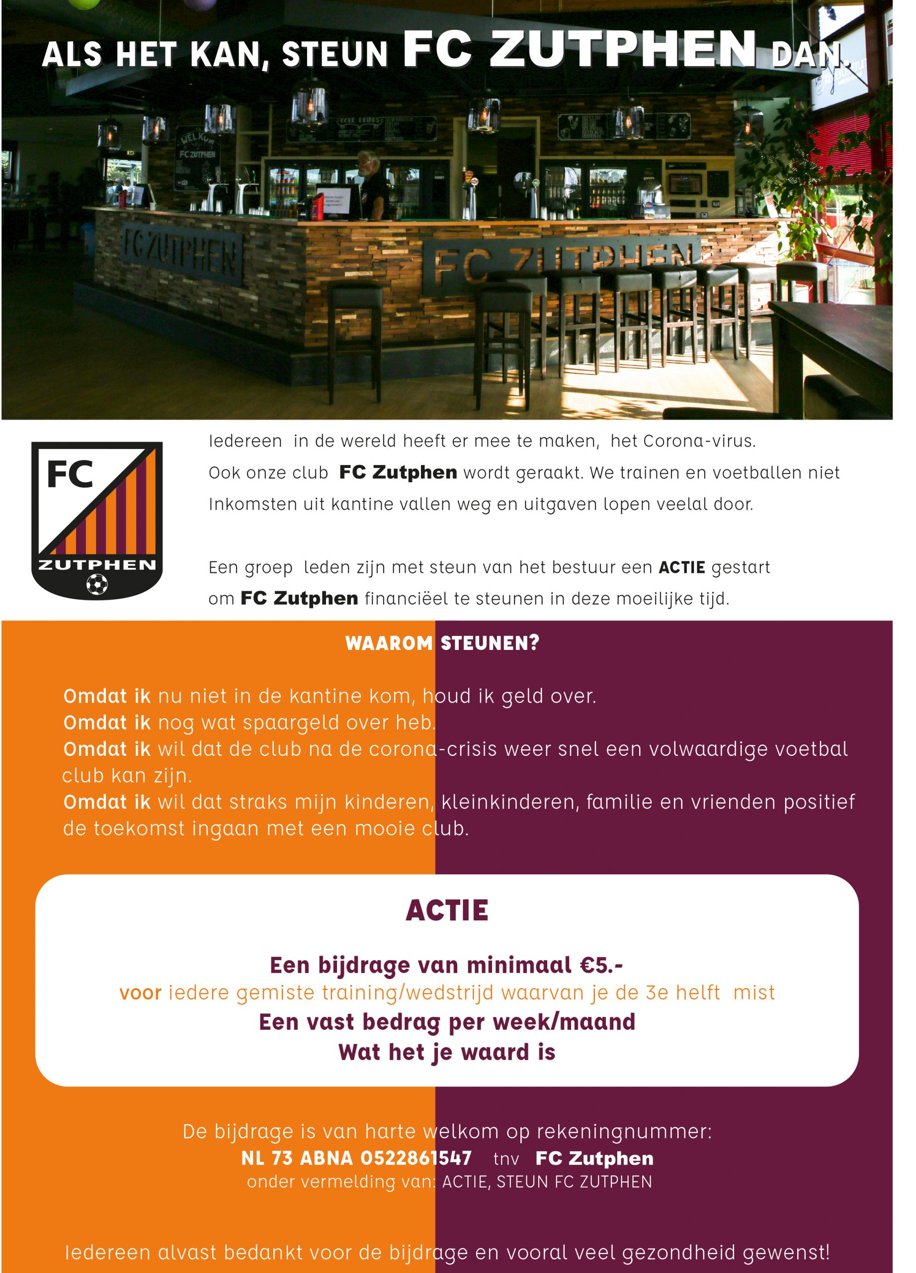 Mochten leden, donateurs, sponsors of andere belangstellenden dit goede voorbeeld willen volgen, en bedragen willen overmaken dan kan dat op bankrekeningnummer NL73ABNA05228.61.547 ten name van FC Zutphen, onder de vermelding “Actie Steun FC Zutphen”.