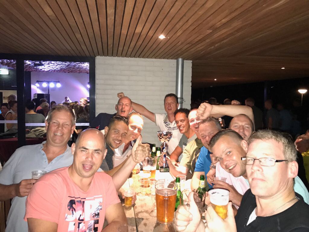 De avond werd voortgezet op het terras van de kantine waar een DJ voor de nodige muzikale gezelligheid zorgde. Een teamspeler raakte hierdoor in hogere sferen en voerde zowaar een heuse act op met een speelster van een vrouwenteam onder het bekende nummer van Paradise by the dashboard light van Meatloaf. Menig gerenommeerde musical in den lande zal hier stil van worden. Deze nu al legendarische act werd gehonoreerd met een minutenlang applaus/hulde/bis bis.Maar goed, wat in Steenderen is gebeurd laten we in Steenderen. Al met al weer een topavondje voorzien van alle ingrediënten!