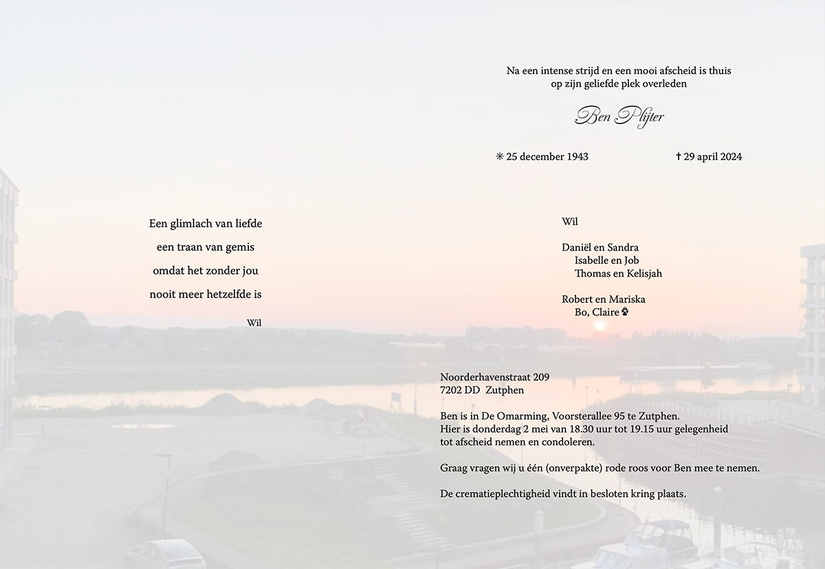 Ben was al geruime tijd ernstig ziek en overleed thuis op zijn geliefde plek.