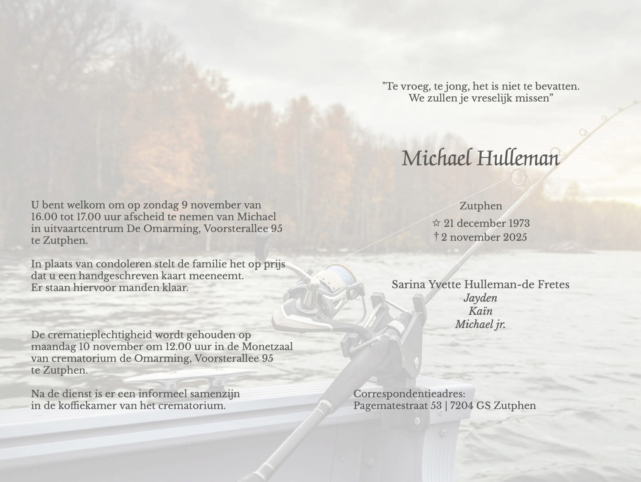 Namens het bestuur en de leden van FC Zutphen wensen wij Sarina, Jayden, Kaïn, Michael en verdere familie heel veel kracht en sterkte toe om dit voor hen zo zware verlies de komende tijd te dragen en te verwerken.