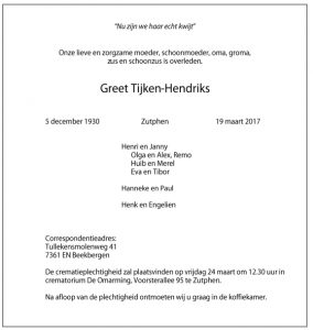 In overleg met de familie Tijken plaatsen wij in verband met het overlijden van Greet Tijken, Lid van Verdienste, de rouwkaart op de website van