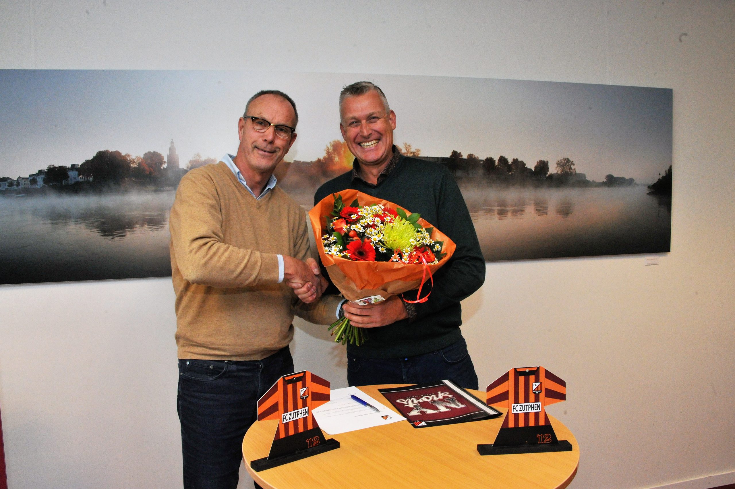 Ten slotte mochten we nog een bekende ontvangen, Maarten Jan Kempe. Hij was de vertegenwoordiger van de Zutphense Uitdaging, zij hebben onlangs voor bewezen diensten en mogelijk in de toekomst te verrichten diensten, een reclamebord aangeboden gekregen van FC Zutphen. Op de foto ziet u Maarten Jan samen met Auke ten Cate (voorzitter sponsorcommissie).