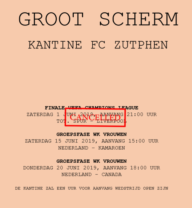 Hierboven zie je het programma, deze wedstrijden zijn allemaal te zien in de kantine van FC Zutphen op het grote scherm. Vanaf een uur voor aanvang van de wedstrijd is de kantine geopend!
