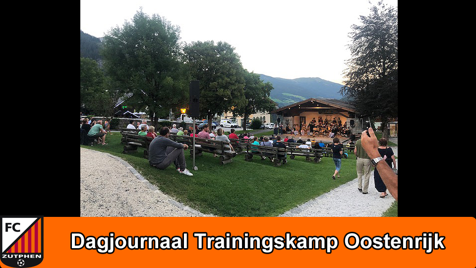 Na het warme eten in restaurant Duxeralm was er een avondprogramma in Krimml. We waren uitgenodigd voor een Platzconcert in de Anton Wallner Musikkapelle in het centrum van het dorp. FC Zutphen had als gast van het dorp daarvoor een speciale uitnodiging ontvangen. We werden zelfs welkom geheten, bij aanvang van het concert, en na enige tijd op het podium geroepen. Daar werden we toegesproken door de voorzitter van het korps en de dorps bestuurder. Jesse de Vries bedankte namens FC Zutphen de gastheren uit Krimml voor de uitnodiging. Dat deed hij op een keurige en voortreffelijke wijze.