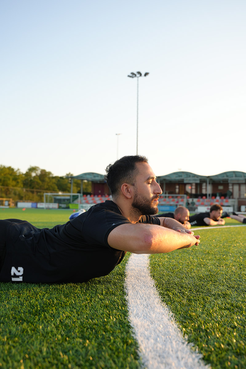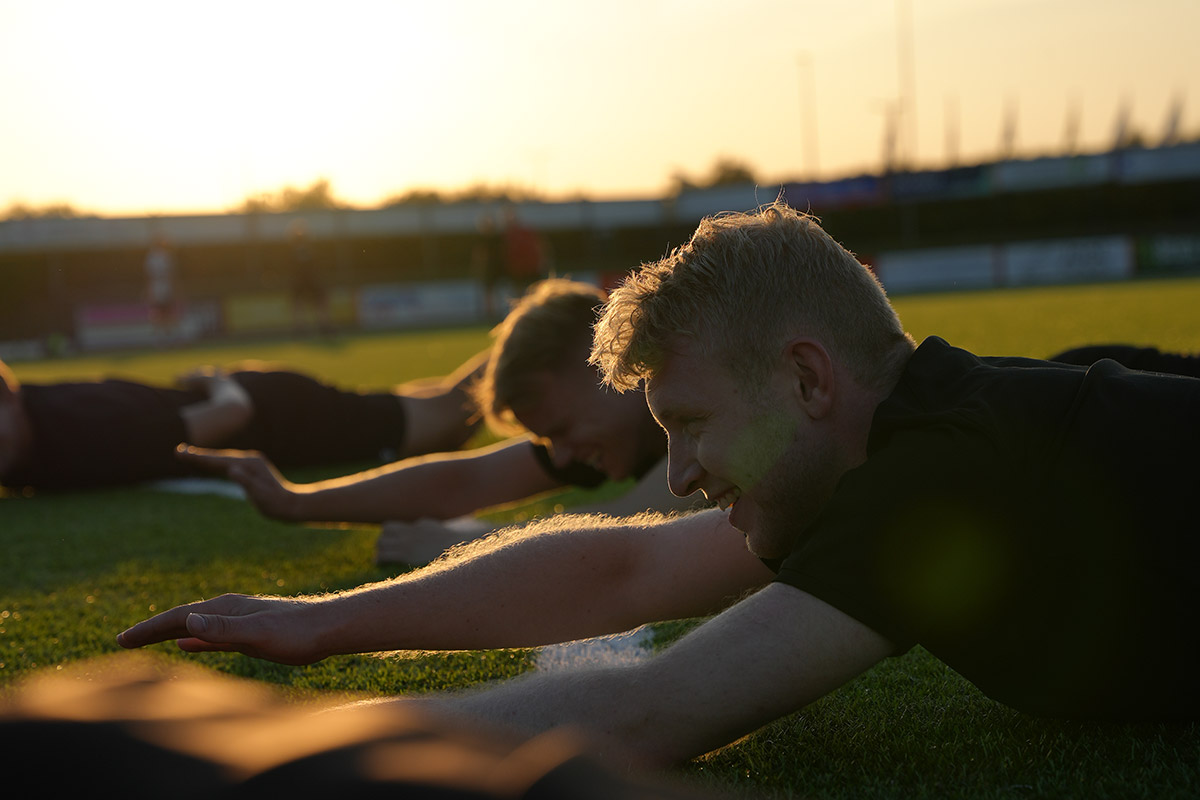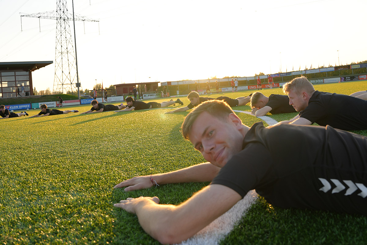 Bij aanvang van de training deed de groep onder leiding van Freddy van den Bosch een aantal kracht- en stabiliteitsoefeningen. ‘Oefeningen goed afronden, daar heb je straks alleen maar baat bij’, riep de medisch verzorger de groep toe.