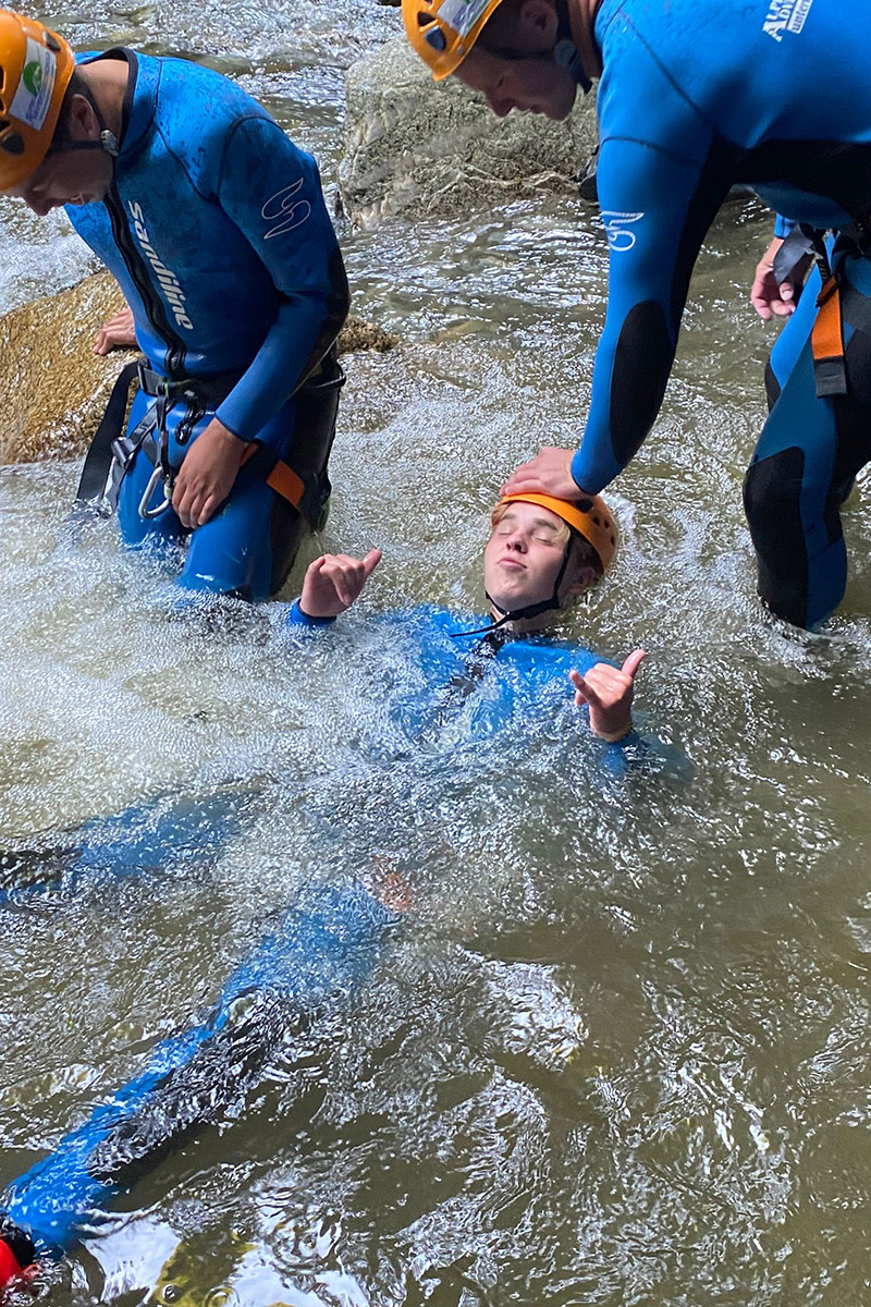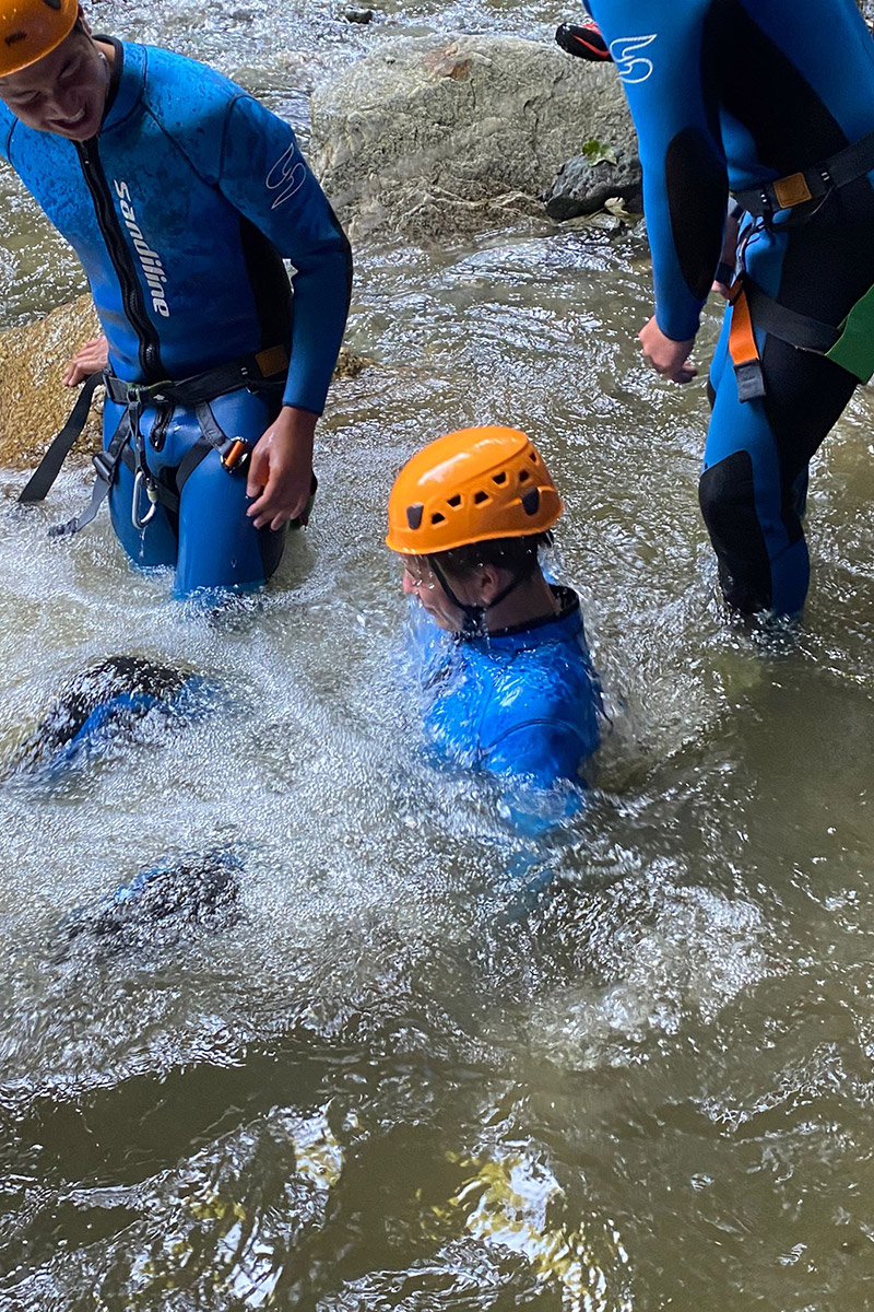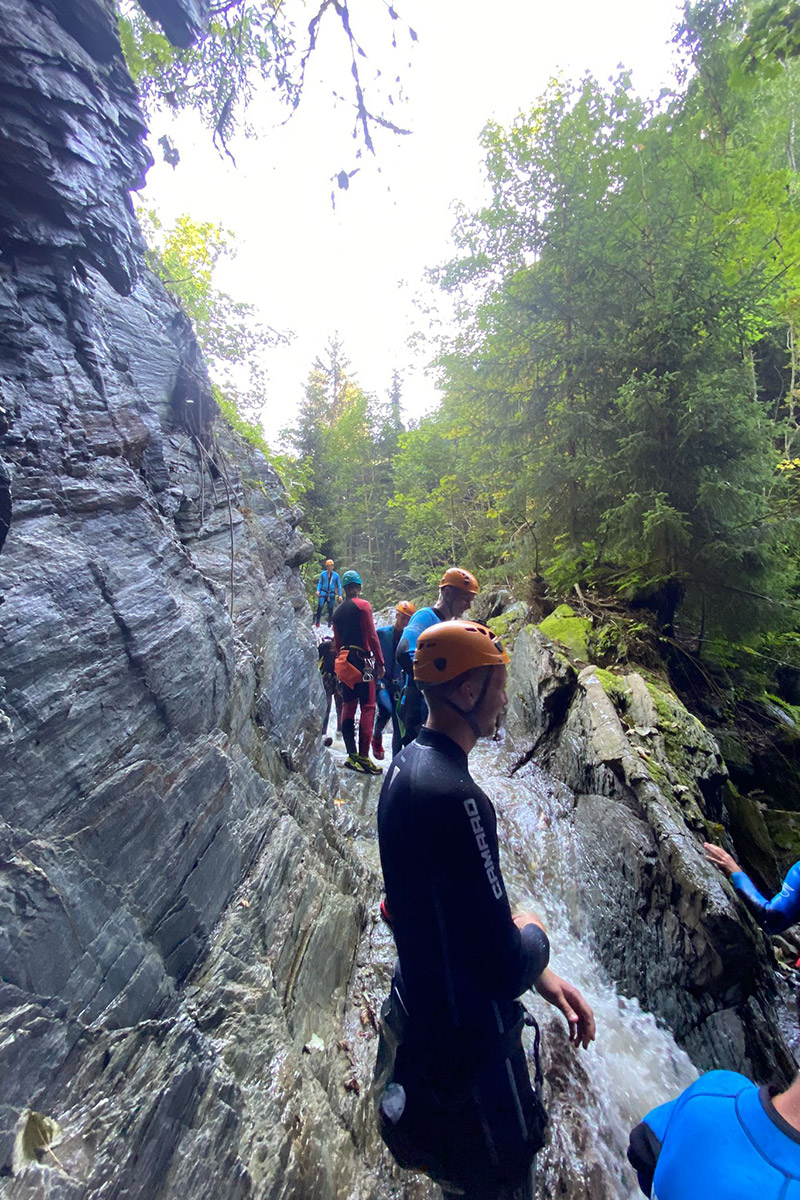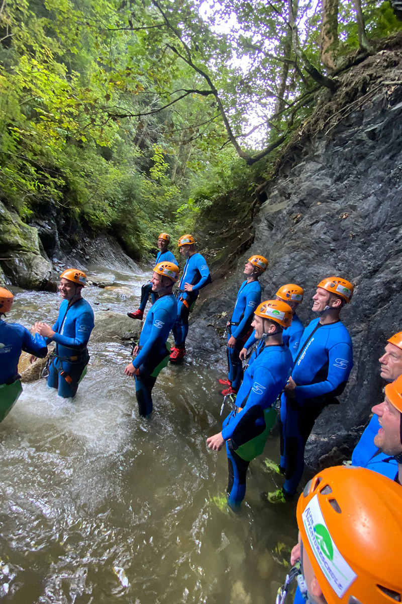 Er werd op tijd vertrokken naar Wald voor het conyoning. Het was voor de jongens een mooie belevenis. Van te voren werd een gezekerde uitrusting verstrekt, waarna de jongens met hun begeleiding in een prachtig gebied aan kwamen, waar de tocht begon. Voor het vertrek in Wald werd van de groep nog een mooie foto gemaakt in hun conyoning uitrusting. Tijdens de afwisselende tocht door het ruige gebied maakte Aleck Boeijink van alle deelnemers prachtige video opnamen waarbij men volop in actie kwam. Mede door de deskundige en professionele begeleiding kwam iedereen weer veilig op de plaats van bestemming aan.