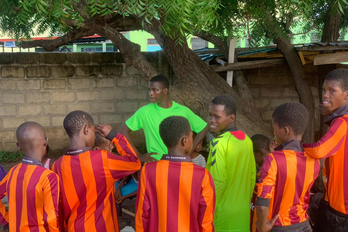 We gaan bij FC Zutphen zuinig om met kleding. Zodat we er zo lang mogelijk en met veel plezier in voetballen. Omdat best een groot deel van onze teams sponsorkleding draagt, wordt sommige kleding na verloop van tijd niet meer gebruikt. Bijvoorbeeld als een sponsor kiest voor een andere vorm van sponsoring, of sponsor wordt van een ander team. In zulke gevallen blijft kleding over. We doen er dan graag mensen een plezier mee. Zoals dit team in Ghana. Zij spelen sinds kort in het oranjerood van FC Zutphen. Staat ze goed toch?!