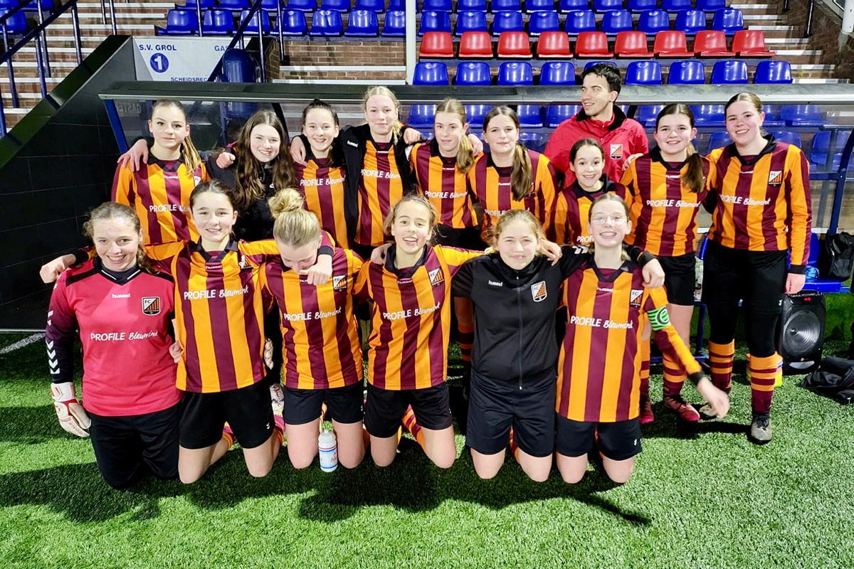 De 2e helft was een stuk fysieker als de 1e helft. Er werden veel duels uitgevochten op het middenveld en Grol ging wat hoger druk zetten. Dit zorgde wel voor gevaarlijke uitbraken van ons, want de ruimtes tussen middenveld en verdediging werd groter aan de kant van Grol. We hielden goed stand en Grol wist maar niet te scoren door goed verdedigingswerk aan onze kant. Er werd goed gecommuniceerd en als iemand werd uitgespeeld, dan werd er gelijk door iemand anders druk gezet op de bal. Na 20 minuten voetballen kregen we een corner. Marley slingerde deze bal voor en deze viel in de goal. Ondanks beeldmateriaal dat meerdere keren is bekeken kon de verslaggever niet zien wie deze op haar naam zou krijgen, maar de stand was in ieder geval 0-5. Het laatste kwartier lieten we erg dominant spel zien. Grol kwam niet meer over de middenlijn en wij kregen nog een aantal goede kansen. Leonie gaf een voorzet op Selin. Zij kopte de bal bij de verdedigster van Grol in de voeten, maar die leverde de bal in bij Nienke. Die twijfelde geen moment en schoot de bal hard en laag in het doel; 0-6 en een mooi moment voor Nienke die haar eerste goal van dit seizoen wist te maken. 2 minuten voor tijd wisten we nog een mooie aanval op te zetten over verschillende schijven. Leonie was het eindstation die de bal beheerst met haar linkervoet in de goal schoot: 0-7 en met deze stand vond de scheidsrechter het mooi geweest. De meiden zijn door naar de halve finale Achterhoek Cup!!