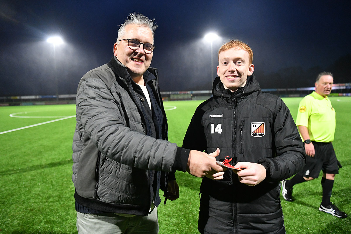 Koen Hulleman werd na afloop van de wedstrijd FC Zutphen – Tubantia uitgroepen tot Man van de wedstrijd. Koen liep op dat moment nietsvermoedend richting de warme kleedkamer, maar hoorde van een aantal supporters dat hij zich op het veld mocht melden voor de huldiging. En zodoende stond hij nog wat langer in de regen, om zijn welverdiende prijs in ontvangst te nemen.