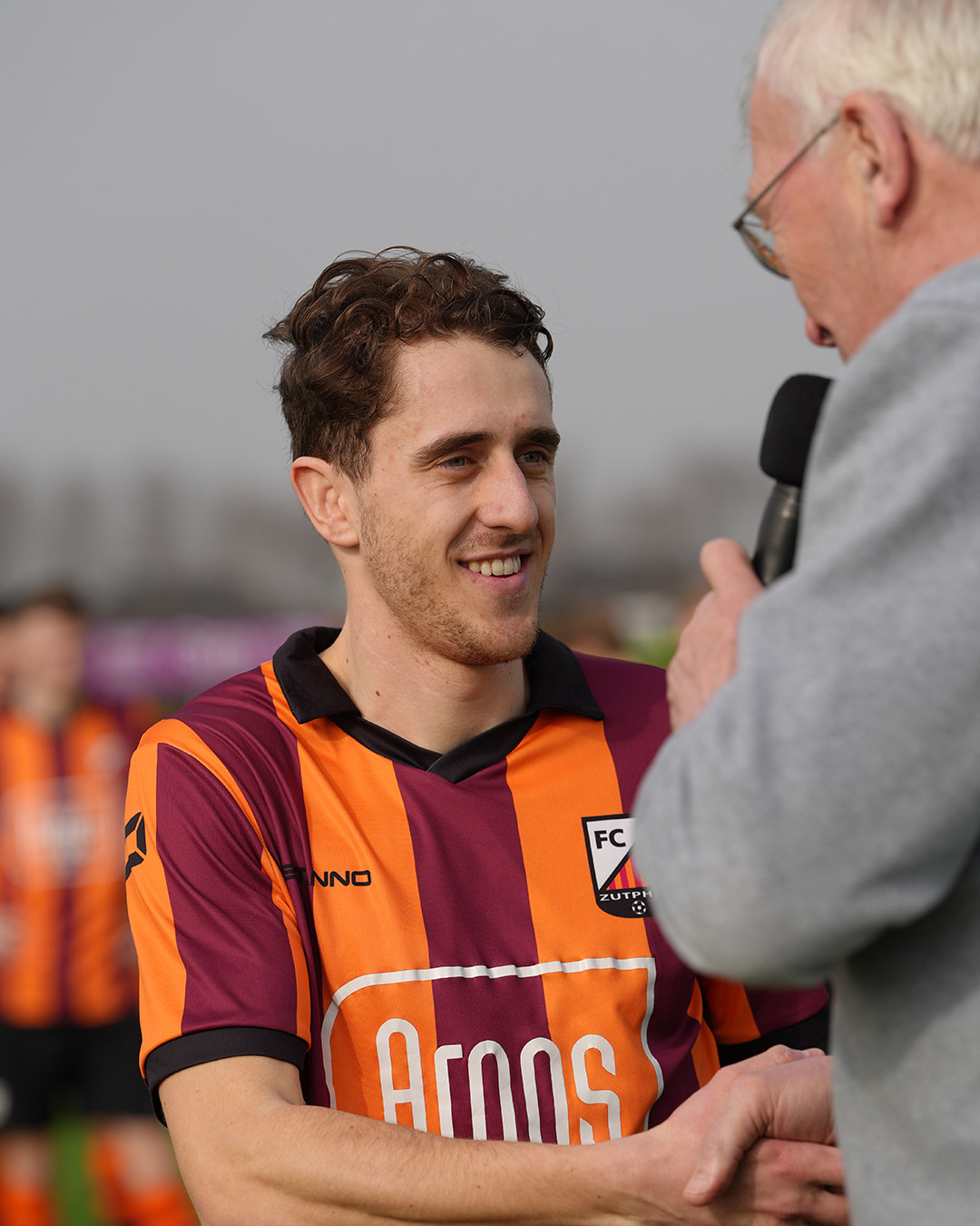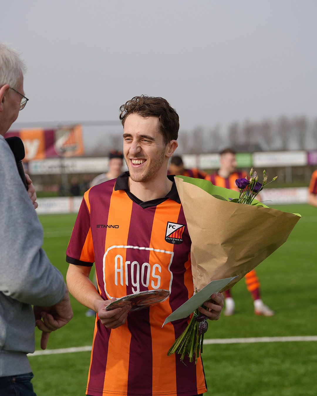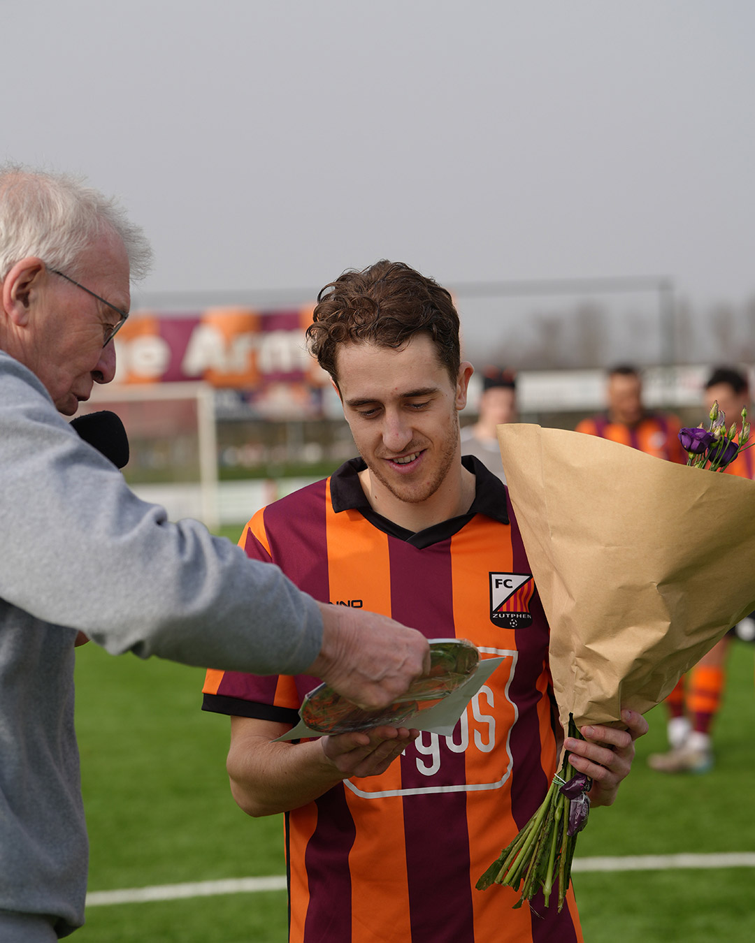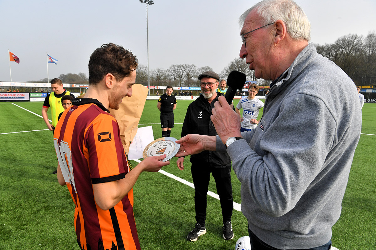 Voorzitter Gerjan Nijland had mooie woorden voor Michalis: ‘Michalis, jij bent 1 van de meest constant presterende spelers uit het team. Een vaardige speler die de bal vrijwel altijd naar de dezelfde kleur speelt. En bovendien ben je op meerdere plaatsen inzetbaar. Maar wat jou ook typeert is dat je een echte clubman bent. Jij bent naast selectiespeler ook jeugdtrainer en dat is een geweldig belangrijke rol die je vervult. Daarom vind ik het een eer om jou te mogen huldigen voor 100 wedstrijden in ons 1e elftal. Je ontvangt van ons bloemen en consumptiebonnen en een mooie zilveren schaal.