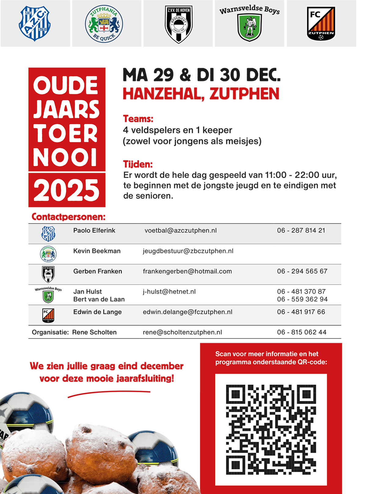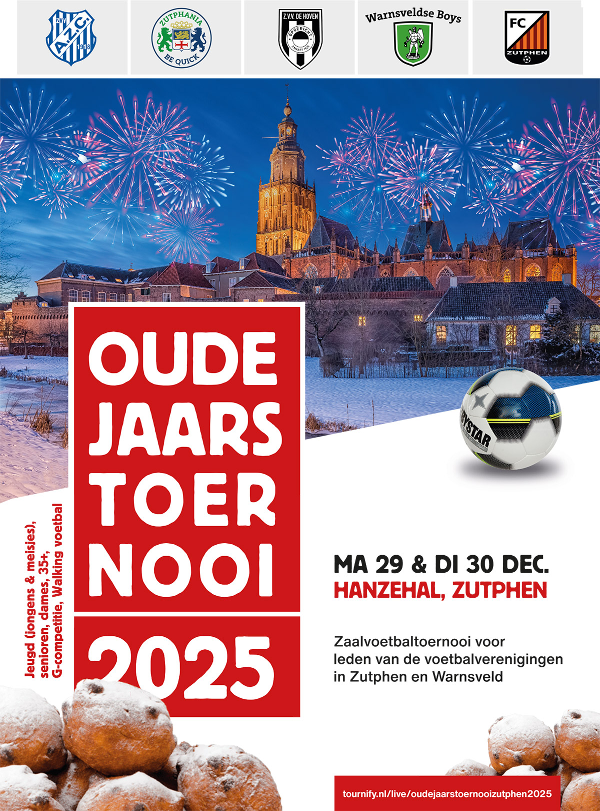 Ook dit jaar sluiten we af met het Oudejaarstoernooi. Samen met de 4 andere voetbalverenigingen uit Zutphen: AZC, ZBC, De Hoven en Warnsveldse Boys organiseren wij op maandag 29 december en dinsdag 30 december een tweedaags toernooi in de Zutphense Hanzehal.