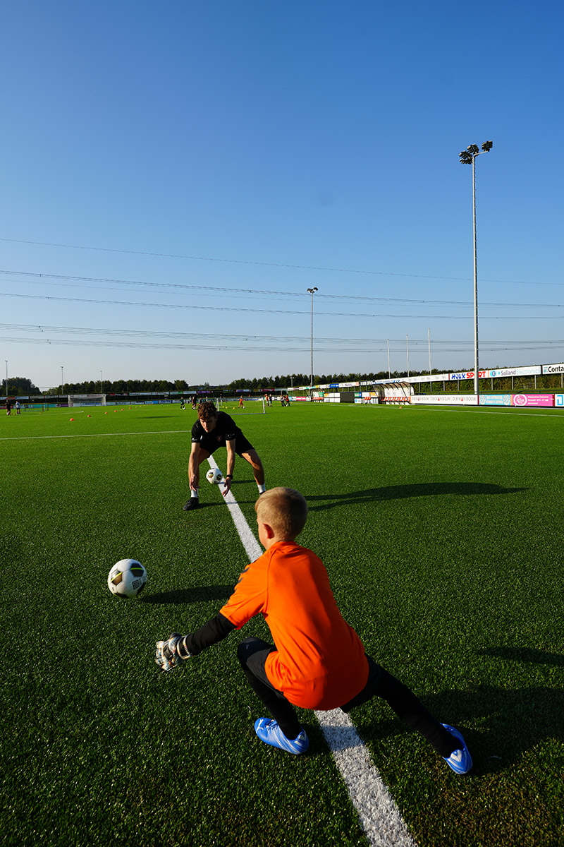 Even verderop doken de keepers in het gras op de schoten en worpen van de keeperstrainers Siem, Daan en Tristan. Ook al duurde de training maar een uurtje, er werden veel oefeningen aangeboden. En de jonge keepers lieten allemaal zien wat ze in hun mars hadden. Er waren jongens bij die nog niet eerder een echte keeperstraining hadden gehad. Ze liepen tevreden en glunderend van het veld. ‘Ze zeiden dat ik het goed deed. Daar ben ik wel blij mee’, was een van de vele positieve reacties.