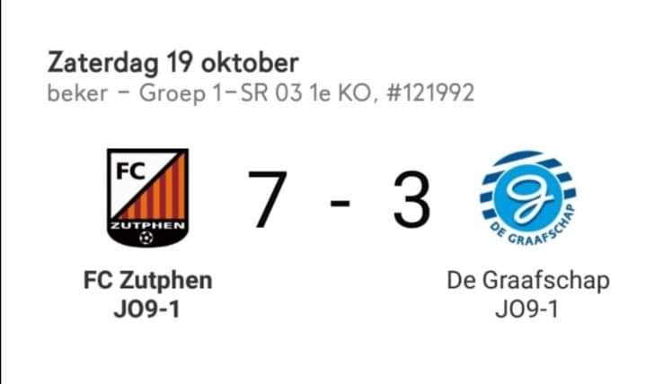 Zaterdagmorgen 19 oktober stonden de jongens van de JO9 1 naast hun bed met gezonde wedstrijdspanning. De een was al heel vroeg wakker en de ander moest 2x poepen in een half uur. Eten en aankleden en op naar FC Zutphen om de bekerwedstrijd tegen De Graafschap te voetballen. In de kleedkamer voelden niet alleen de kids wedstrijdspanning, ook trainer Rens en leiders Joran, Joost en Jessica vonden het best spannend. De jongens zeiden tegen elkaar: ” deze wedstrijd gaan we winnen”. Vol zelfvertrouwen en met een sterke teamgeest gingen ze het veld op.
