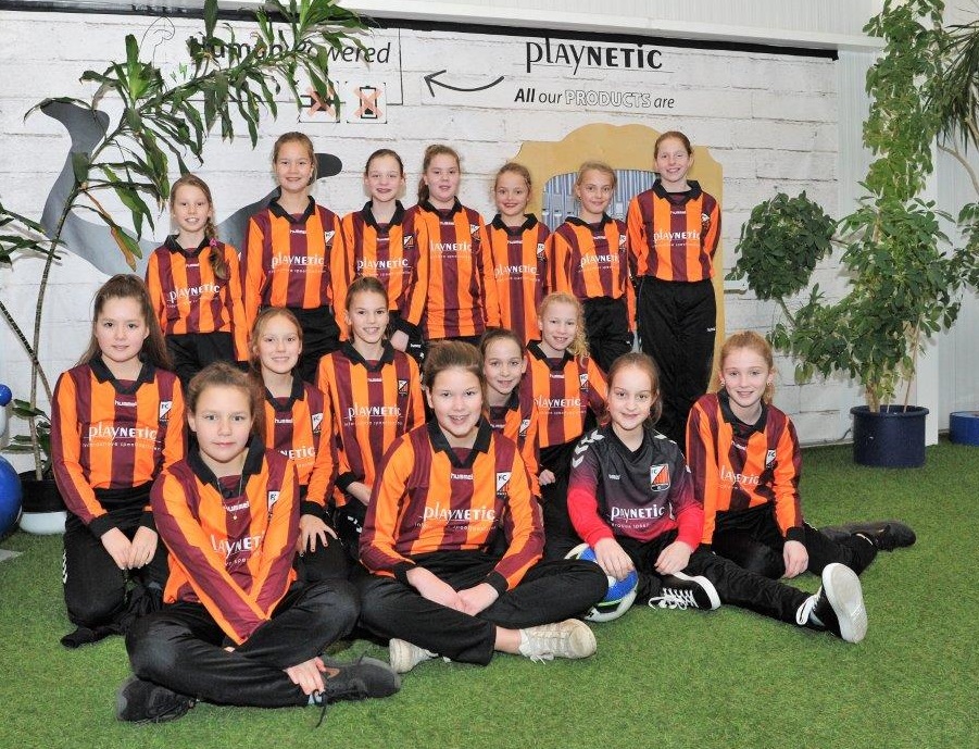 De nieuwe meiden vielen ook nog eens met hun neus in de boter, want ons team is helemaal in het nieuw gestoken tijdens de winterstop. De ouders van Yuno, die altijd al erg betrokken zijn bij ons team, hebben met hun bedrijf Playnetic alle meiden en leiding in nieuwe kleding gestoken. Naast een nieuw voetbalshirt kreeg iedereen een trainingspak en een voetbaltas. Zo werden we niet alleen het leukste MO13-2 team, maar ook nog eens het best geklede team van FC Zutphen. Roy en Nikki heel erg bedankt.