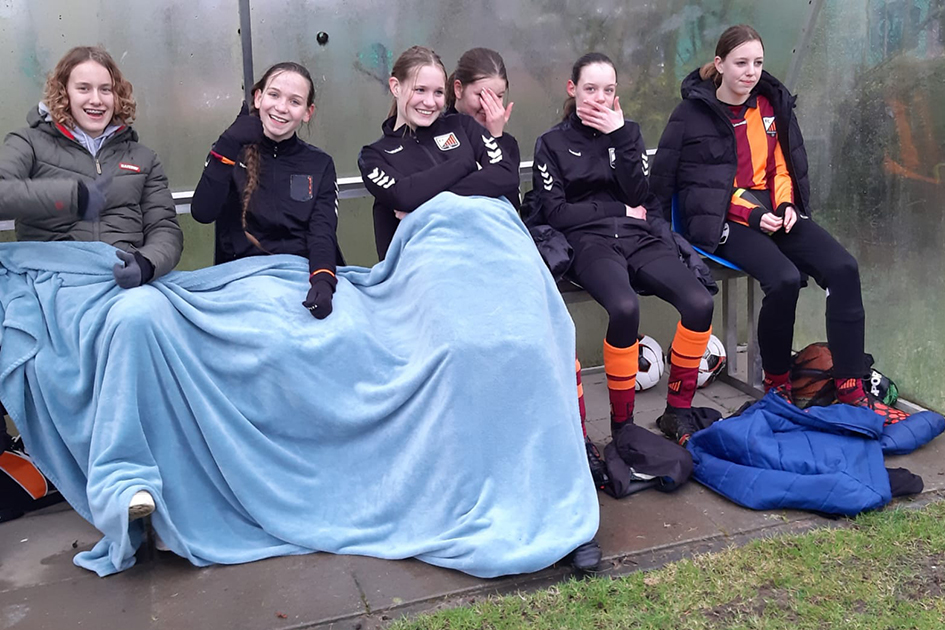 Ondanks het weer was het erg gezellig in de dug-out. Met z’n allen onder een kleedje. Het publiek, bestaande uit vijf moeders en een eenzame vader, heeft genoten van een leuke positieve wedstrijd van onze kant. Na de wedstrijd kregen we dan ook terecht een compliment van de scheidsrechter. Hij was minder positief over de negatieve houding van de meiden/leiding van Bergh…maar ach, daar hebben wij geen last van, want wij zijn Fc Zutphen.