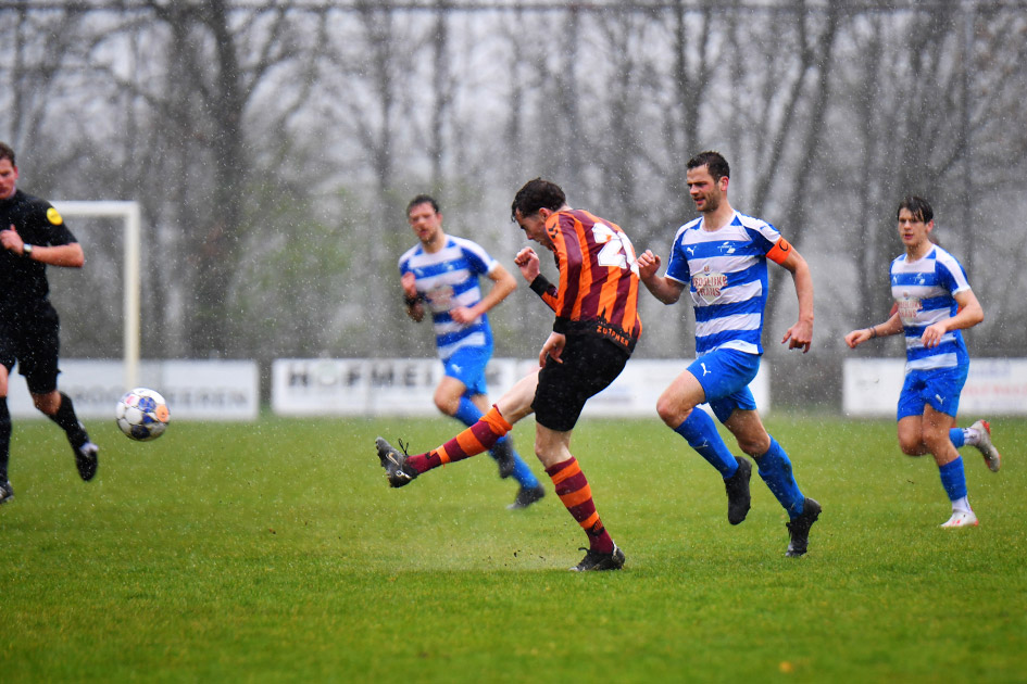 Het was zaterdagmiddag op sportpark de Overkant een compleet waterballet in de 1e helft. De regen kwam 10 minuten na aanvang van de wedstrijd met
